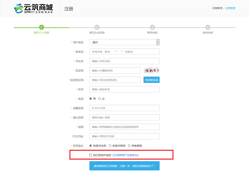 在云筑商城中,如果您原来就是云筑网的用户,无需进行注册,可直接使用原本的账户在云筑商城进行登录,点击云筑商城便可直接使用。新的供应商想要入驻商城必须先注册云筑网账号,具体的流程如下: