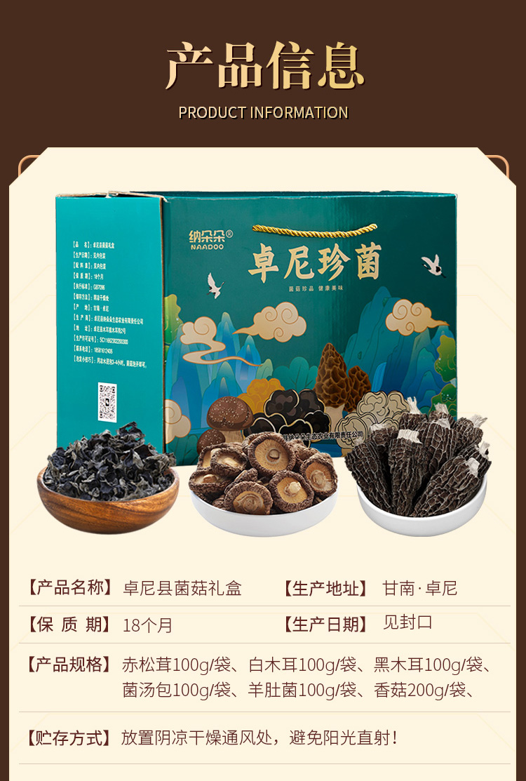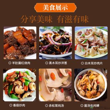 套餐三:黑木耳袋装100g,白木耳袋装100g,羊肚菌袋装100g,菌汤包袋装100g,香菇袋装200g