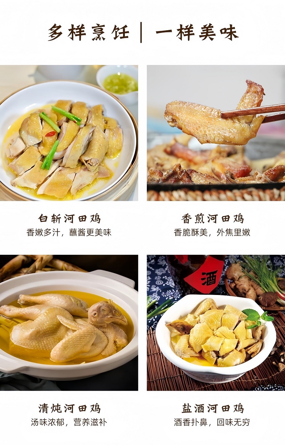 • 阉割意义:除改善肉质外,阉割后的公鸡性情更温顺,专注生长而非争斗,能积累更多营养,且鸡肉的蛋白质、氨基酸含量比普通河田鸡更高,滋补价值更强。