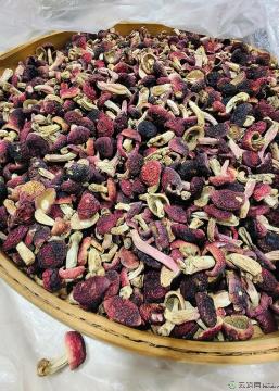 • 外观特征:菌盖呈深红色或暗紫色,中央凹陷,边缘内卷;菌肉白色,质地脆嫩;菌褶细密呈蓝色,干品香气浓郁。